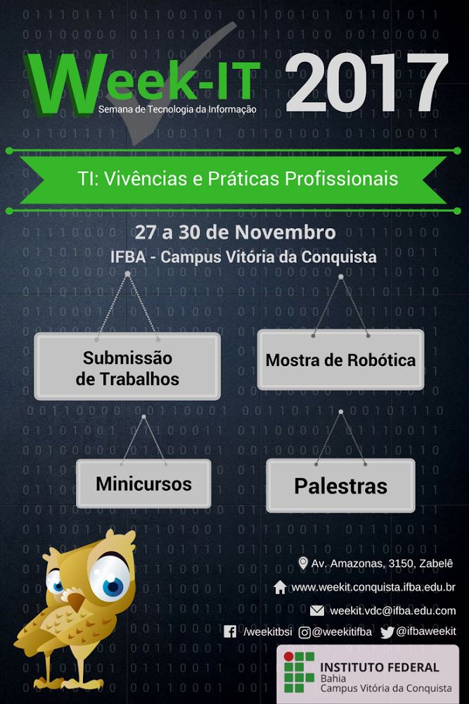 O IFBA campus Vitória da Conquista realiza, entre os dias 27 a 30 de novembro, a terceira edição do Week-It: Semana de Tecnologia da Informação. O evento tem como objetivo estimular a criação e administração de tecnologias ou processos, trazendo novas ferramentas, técnicas e procedimentos práticos, que reforçam a importância da inovação tecnológica utilizada nas diversas áreas de atuação das Tecnologias da Informação e Comunicação (TIC).