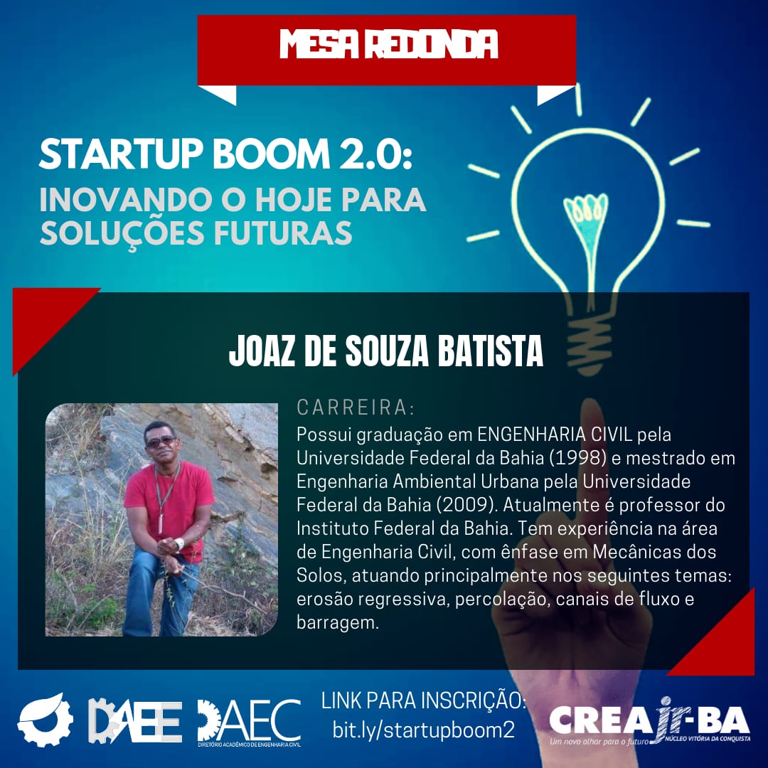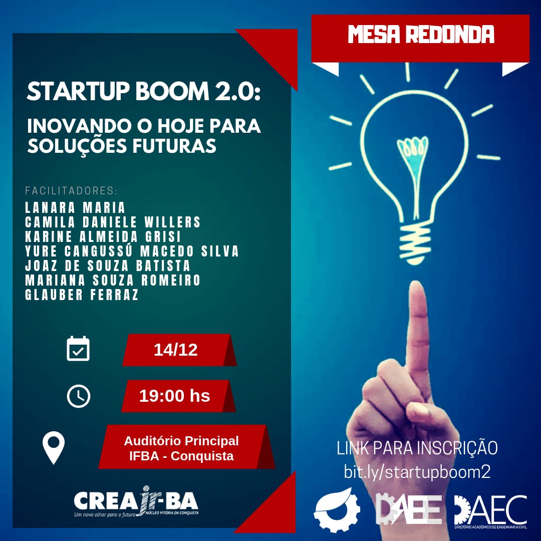 Uma dessas ações será o evento Startup boom 2.0: Inovando o hoje para soluções futuras que acontecerá no dia 14 de dezembro (sexta-feira), às 19h, no auditório principal do IFBA, Campus Vitória da Conquista.