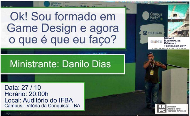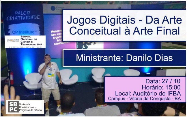 Hoje (27), acontece duas palestras que fazem parte da programação da Semana Nacional de Ciência e Tecnologia (SNCT), no auditório do IFBA – Campus Vitoria da Conquista, cujos temas são: “Jogos Digitais – Da Arte Conceitual à Arte Final” e ” Ok! Sou formado em Game Design e agora o que é que eu faço?”.